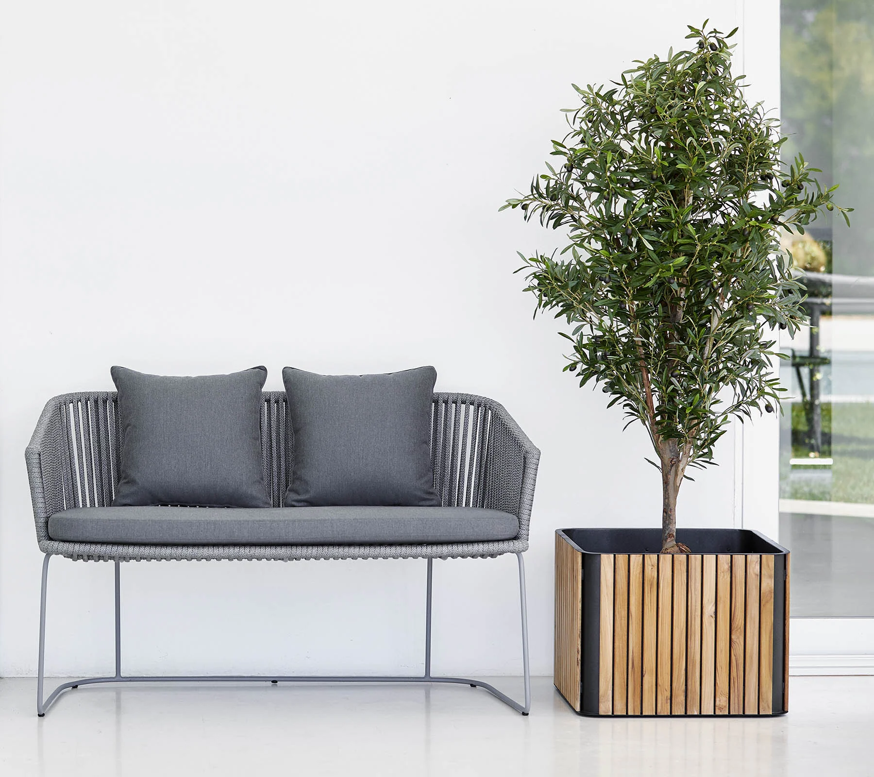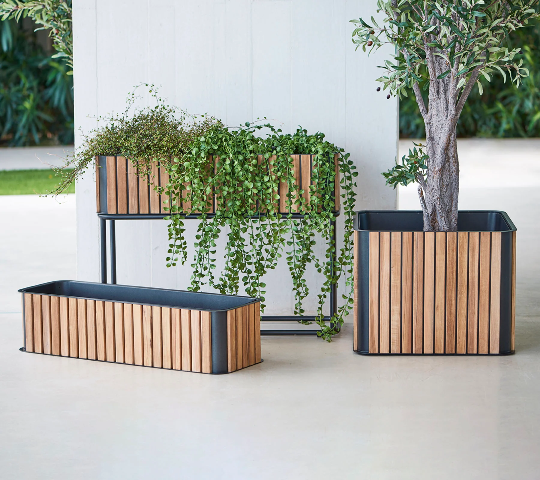 Combine är en modern blomlåda som kombinerar stilren design med noggrant utvalda material. Den harmoniska mixen av varm teak och pulverlackerat aluminium skapar ett samtida uttryck som passar lika bra på altanen som på terrassen eller i trädgården. Resultatet är en planteringslåda som både är dekorativ och funktionell.