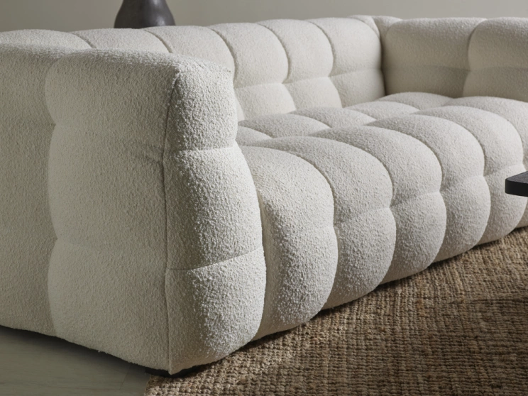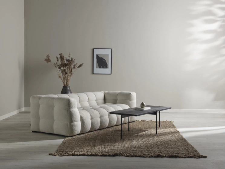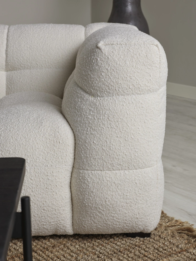 Cream soffa är en generös och modern soffa klädd i ett mjukt bouclé-tyg som ger rummet både värme och karaktär. Med sitt balanserade formspråk kombinerar Cream mjuka, rundade linjer med en robust och boxig silhuett – en design som känns lika inbjudande som självsäker. Resultatet är en soffa som snabbt blir hemmets naturliga samlingspunkt.