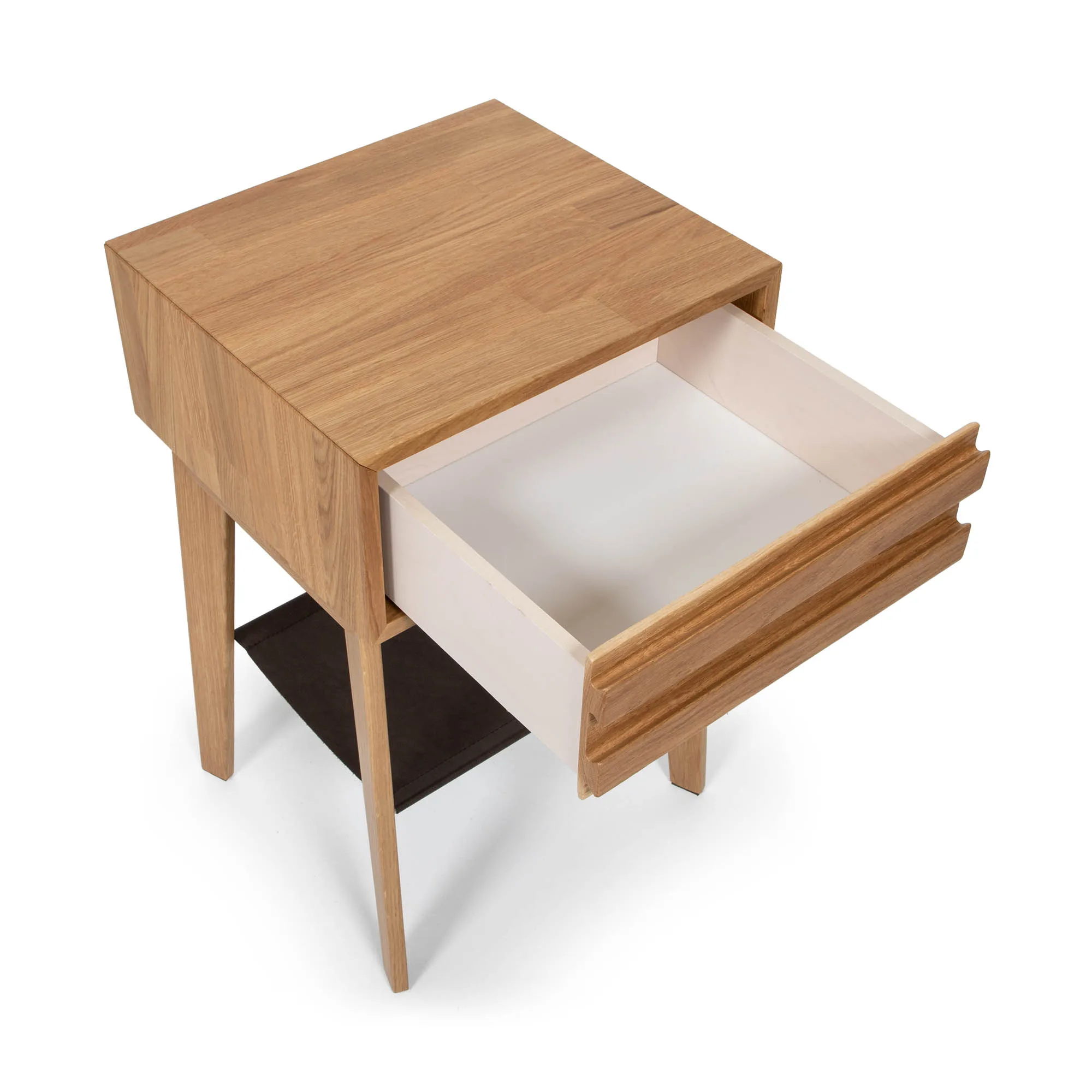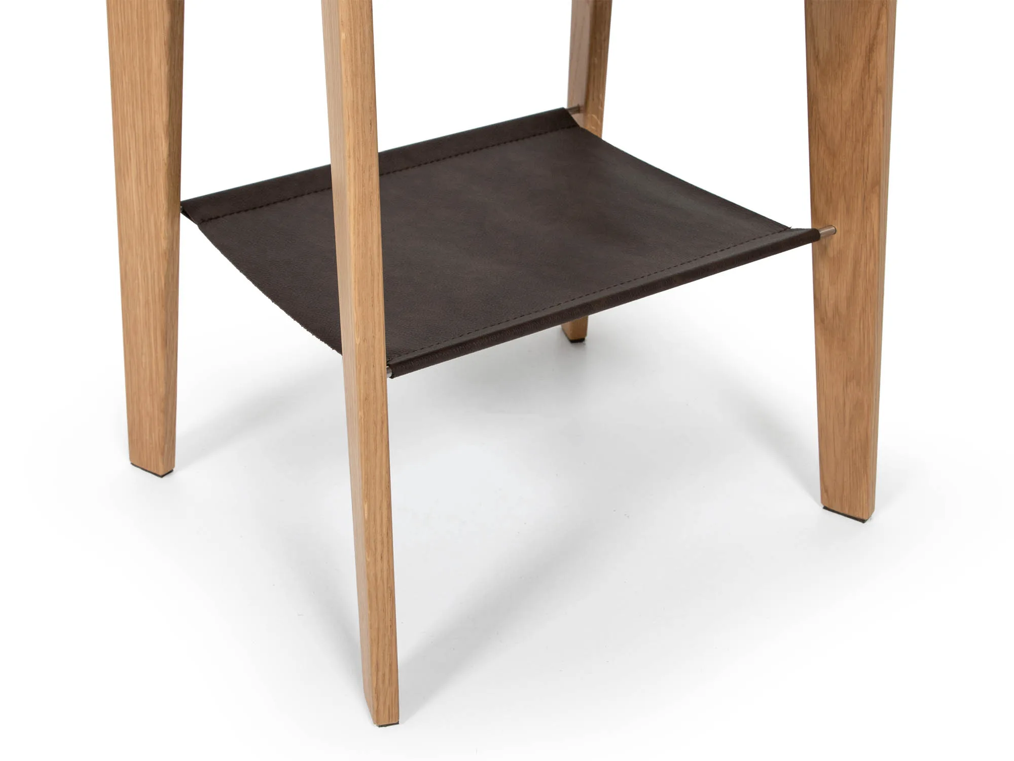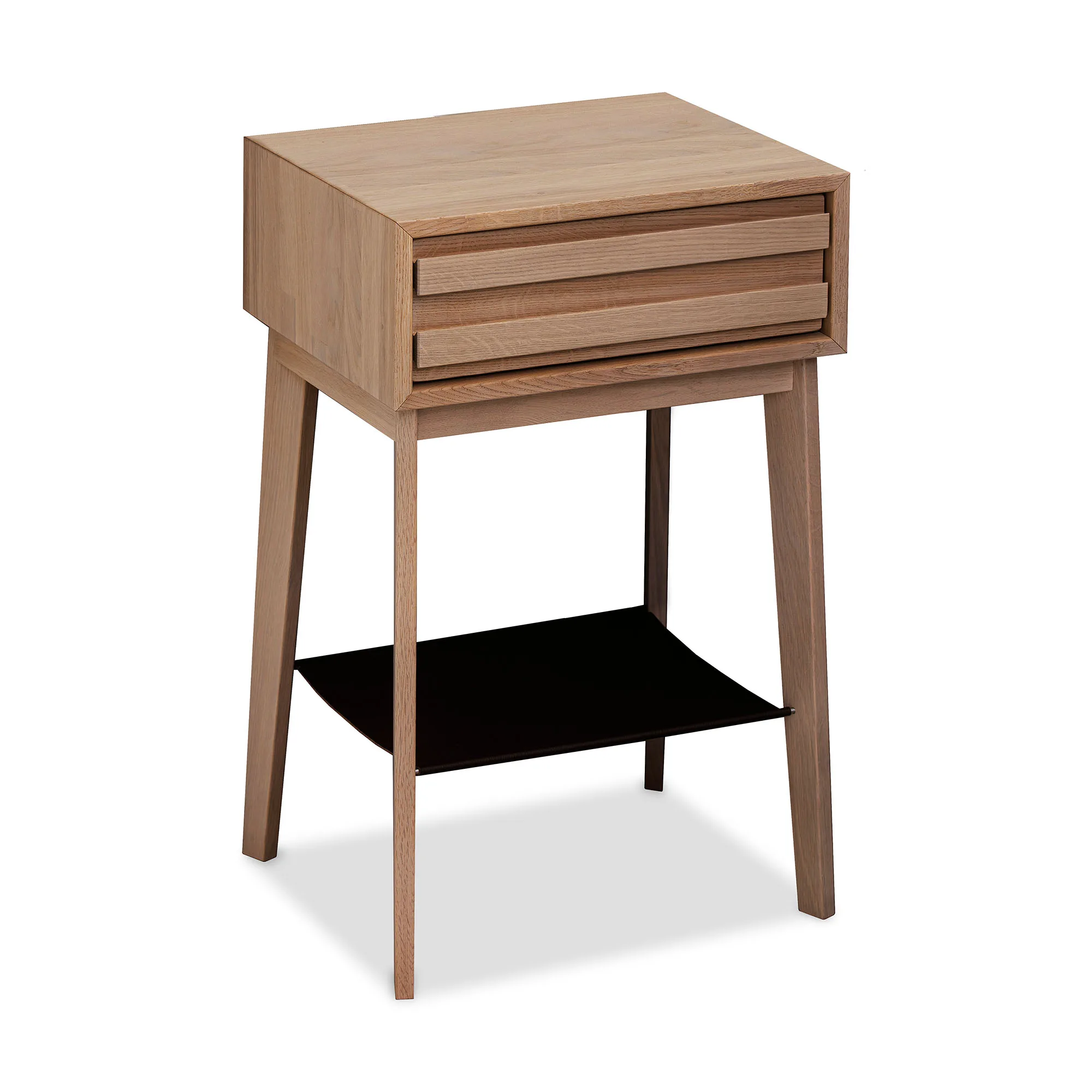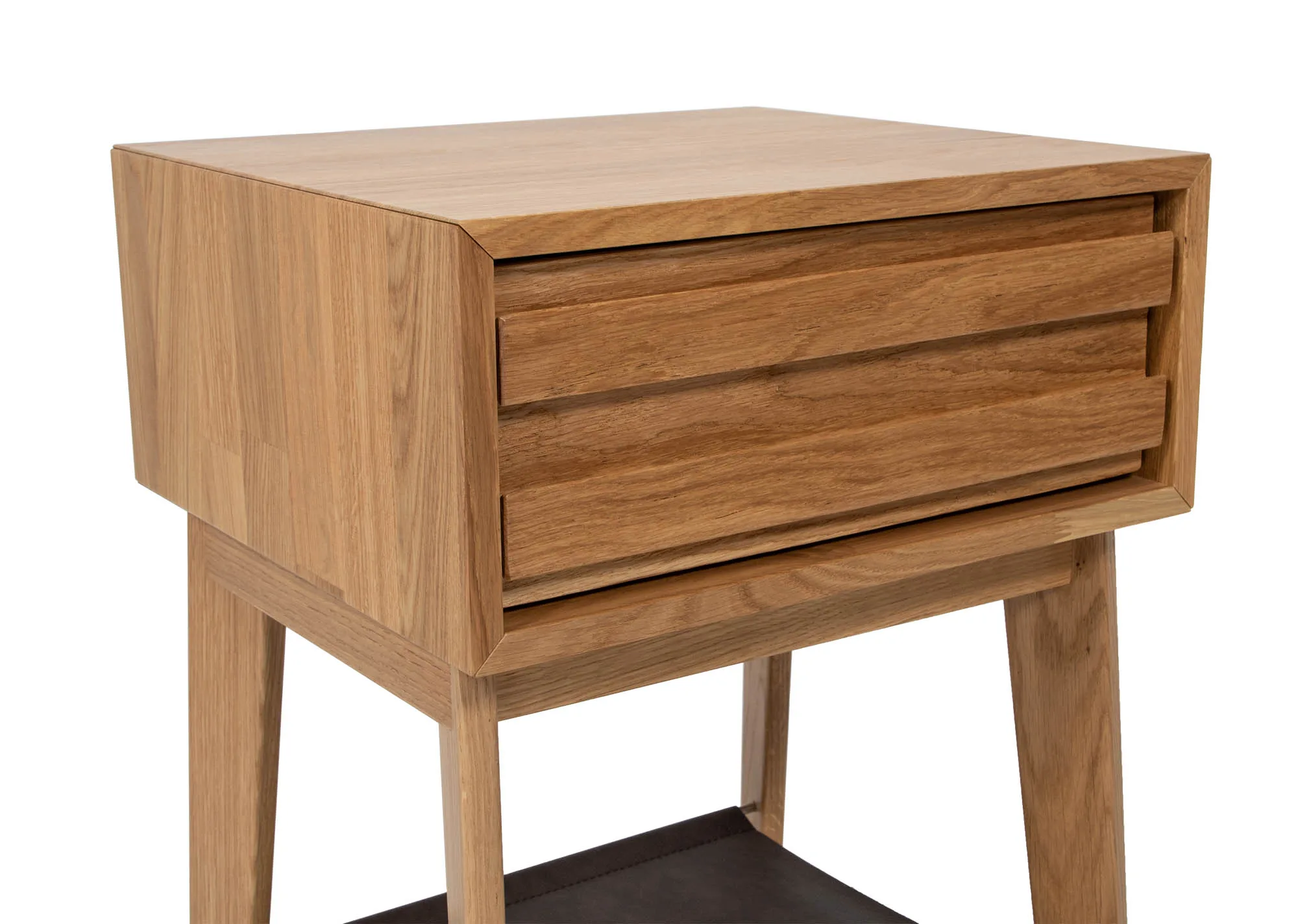 Eicon Tall är utrustat med en mjukstängande utdragslåda – perfekt för förvaring av mobil, glasögon, bok eller andra småsaker du vill ha nära men ändå dolda. Som en extra detalj har sängbordet också en mörkbrun läderhylla, en varm och elegant kontrast till träet som ger ytterligare avställningsyta för dekorationer eller kvällsläsning.