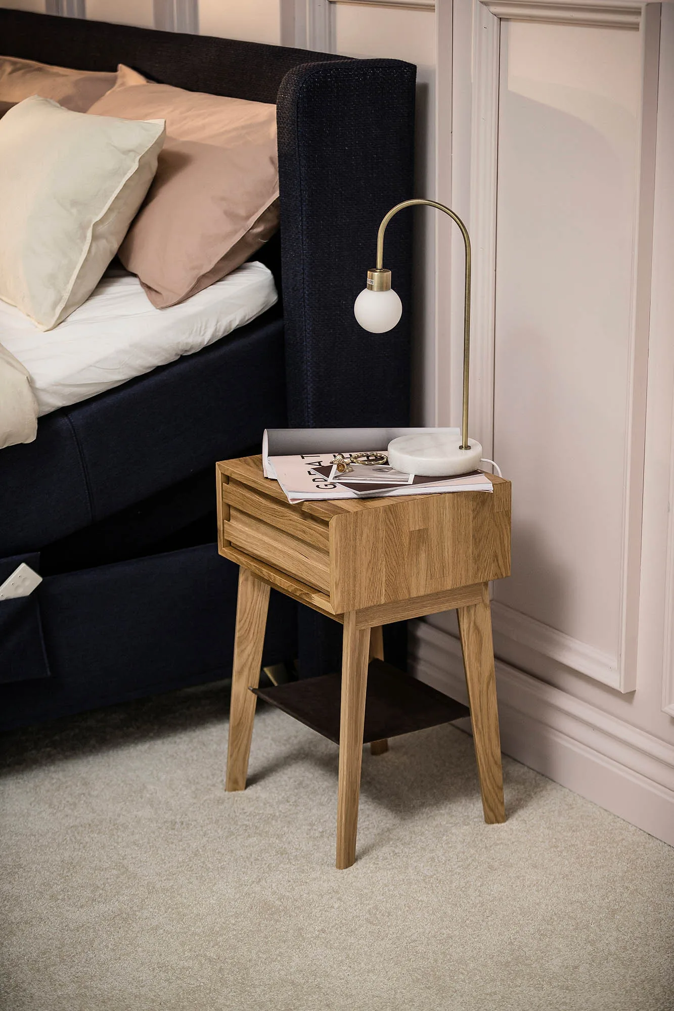 Sängbordet finns i tre stilrena och omsorgsfullt utvalda träutföranden: