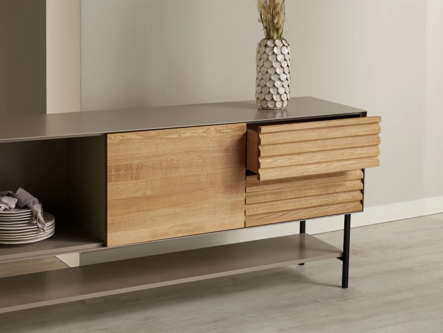 ESSENCE Sideboard har en tidlös design med sitt eleganta formspråk och diskreta detaljer. Med stommar i en varmgrå kulör, låd- och skåpsfronter i massiv oljad ek och ett underrede i mattsvart sandlackad metall skapar den ett varmt och trendigt intryck i inredningen. I detta sideboard finns möjlighet för både synlig och dold förvaring. Alla öppningsbara enheter har softclose.