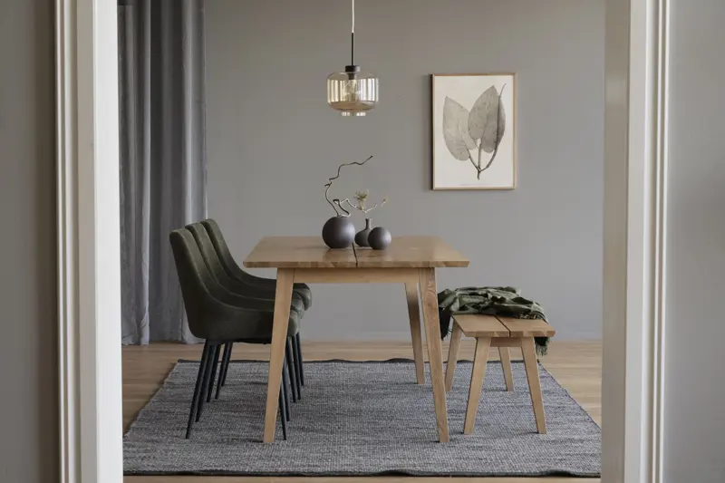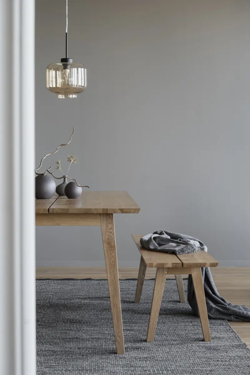 Melfort sittbänk 144 cm i borstad vildeksfanér med massiva ben och sarg har en tvådelad sittyta. Melfort sittbänk passar perfekt till Melfort matbord i 180 cm. Ställ en alternativt två bänkar till matbordet och det ger en snygg helhet matgruppen.