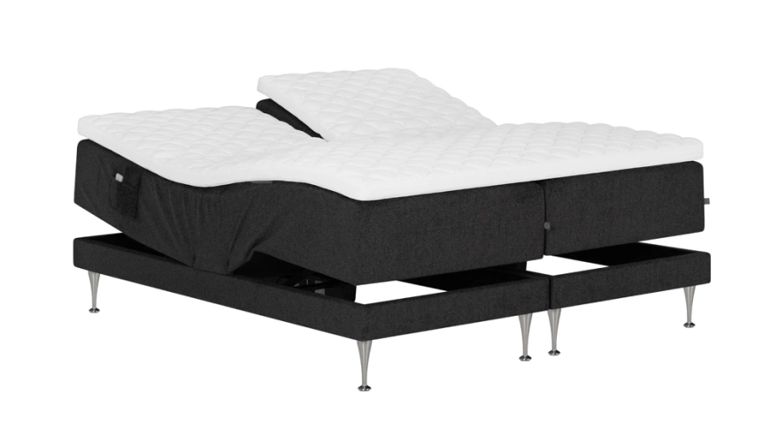 Här får du en ställbar säng med bäddmadrass Quilt Split och kromade metallben. Motor har 5 års garanti.