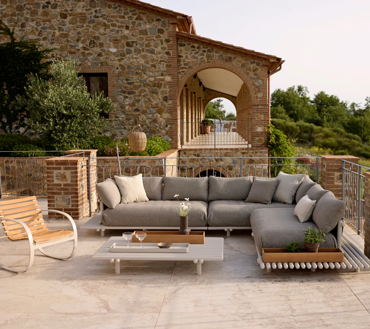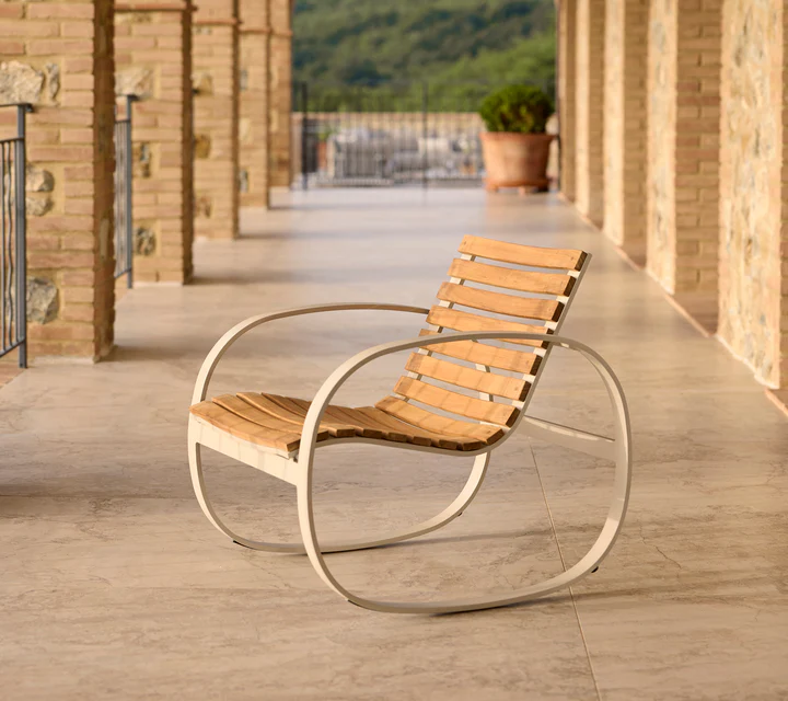 Parc gungstol utmärker sig med sin minimalistiska estetik och högkvalitativa materialval. Stolen är tillverkad av hållbar teak och robust aluminium, vilket skapar en vacker kontrast mellan träets naturliga värme och metallens svala elegans. Teakträet är känt för sin exceptionella väderbeständighet och får med tiden en vacker silvergrå patina om det lämnas obehandlat, vilket ytterligare förstärker dess tidlösa karaktär. Den kompakta storleken gör att den smälter in sömlöst i både små balkonger och rymliga terrasser.