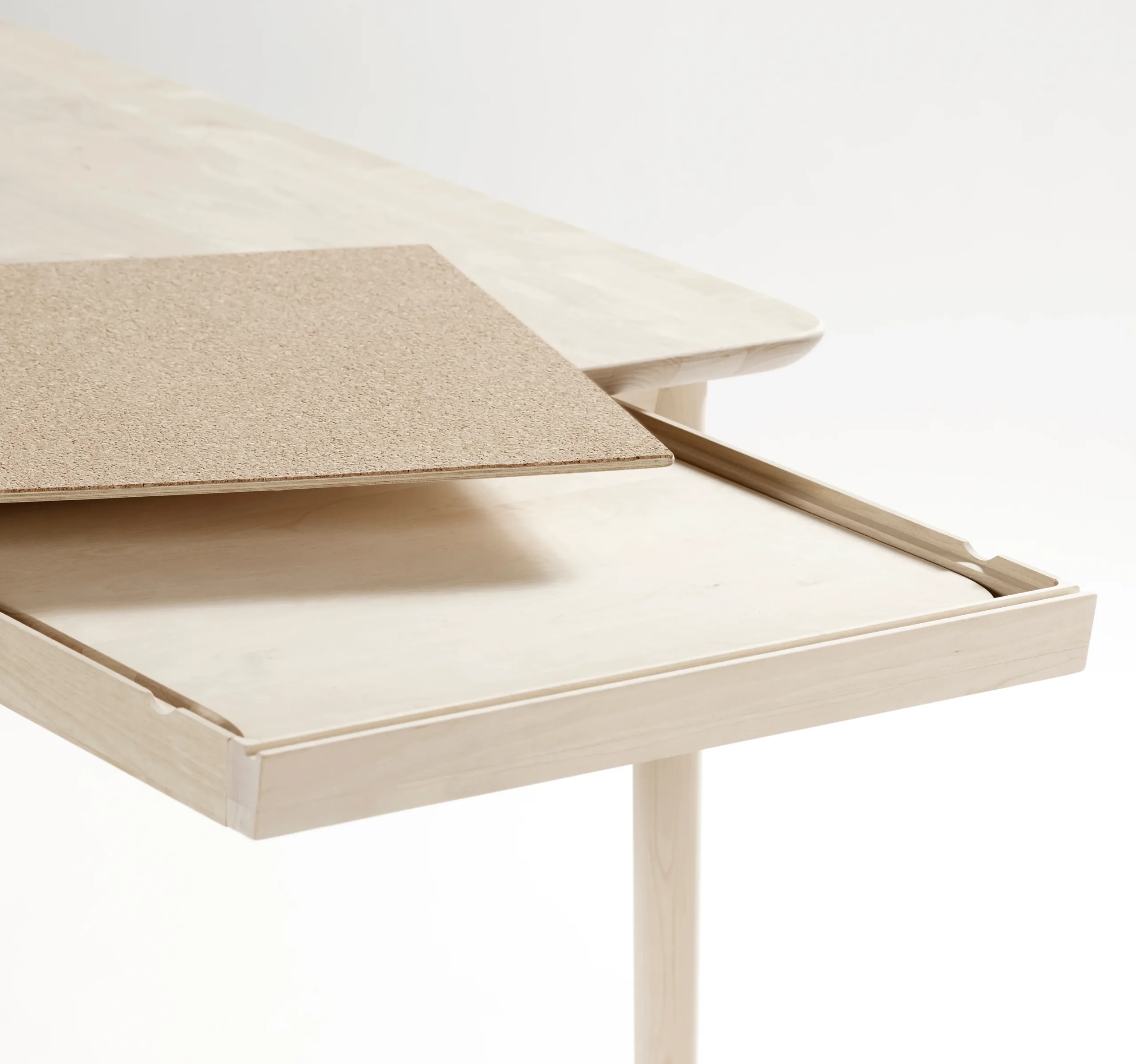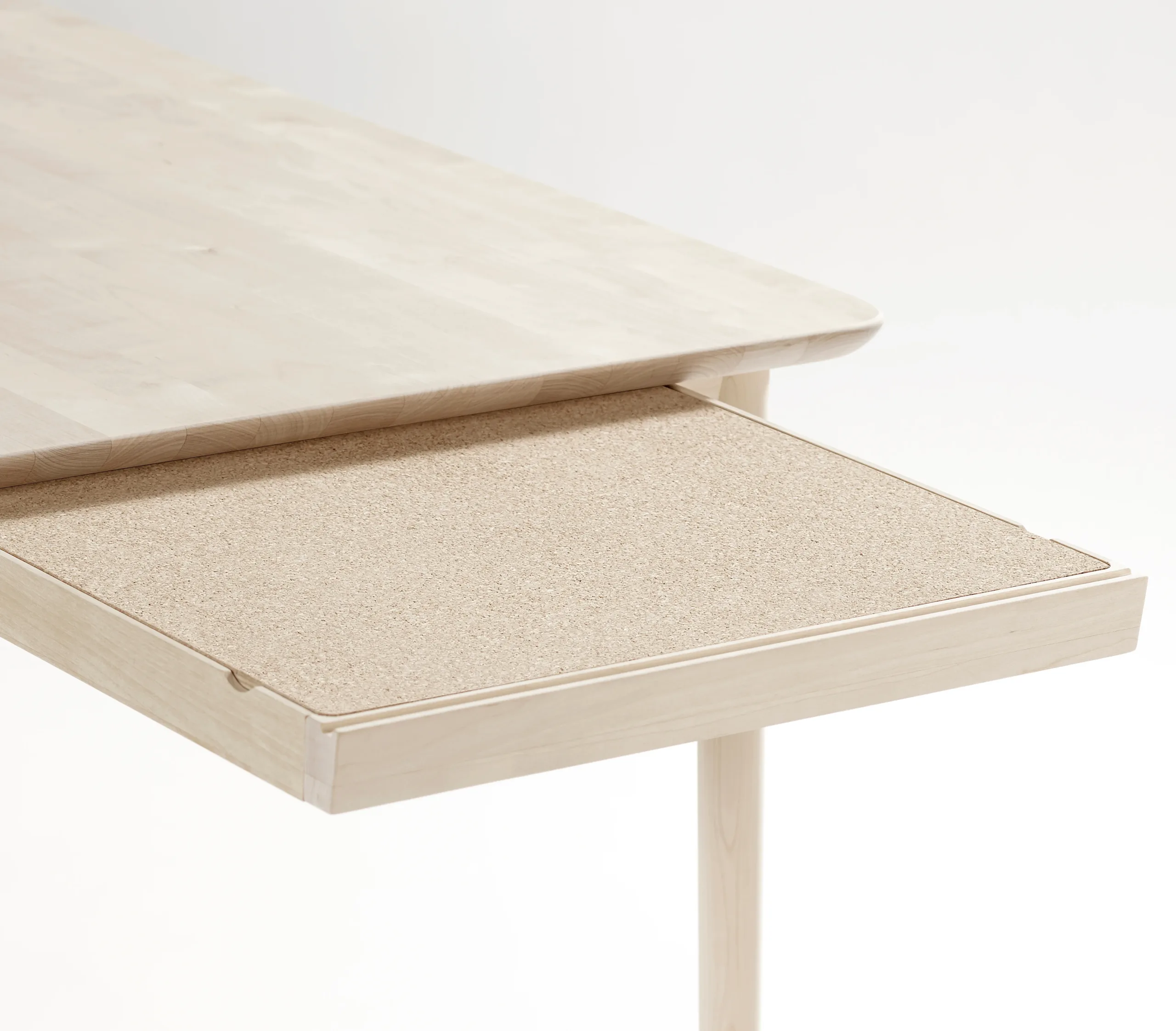 En unik och genomtänkt detalj är den extra skivan med värmetålig avställningsyta i kork, som enkelt dras ut från ena kortsidan. Den lösa korkskivan kan även tas ur och användas separat, vilket gör Prima Vista till ett praktiskt och flexibelt matbord – perfekt när varma kärl snabbt behöver ställas av utan att kompromissa med bordsskivans yta.