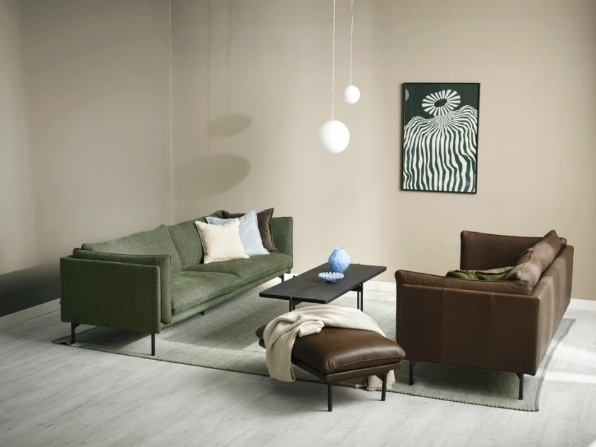 De smäckra metallbenen lyfter soffan visuellt och skapar ett lätt, svävande uttryck som passar särskilt bra i moderna och luftiga miljöer. River har en välbalanserad proportionering som gör den enkel att kombinera med olika inredningsstilar, oavsett om du föredrar minimalistiskt, nordiskt eller mer klassiskt uttryck.