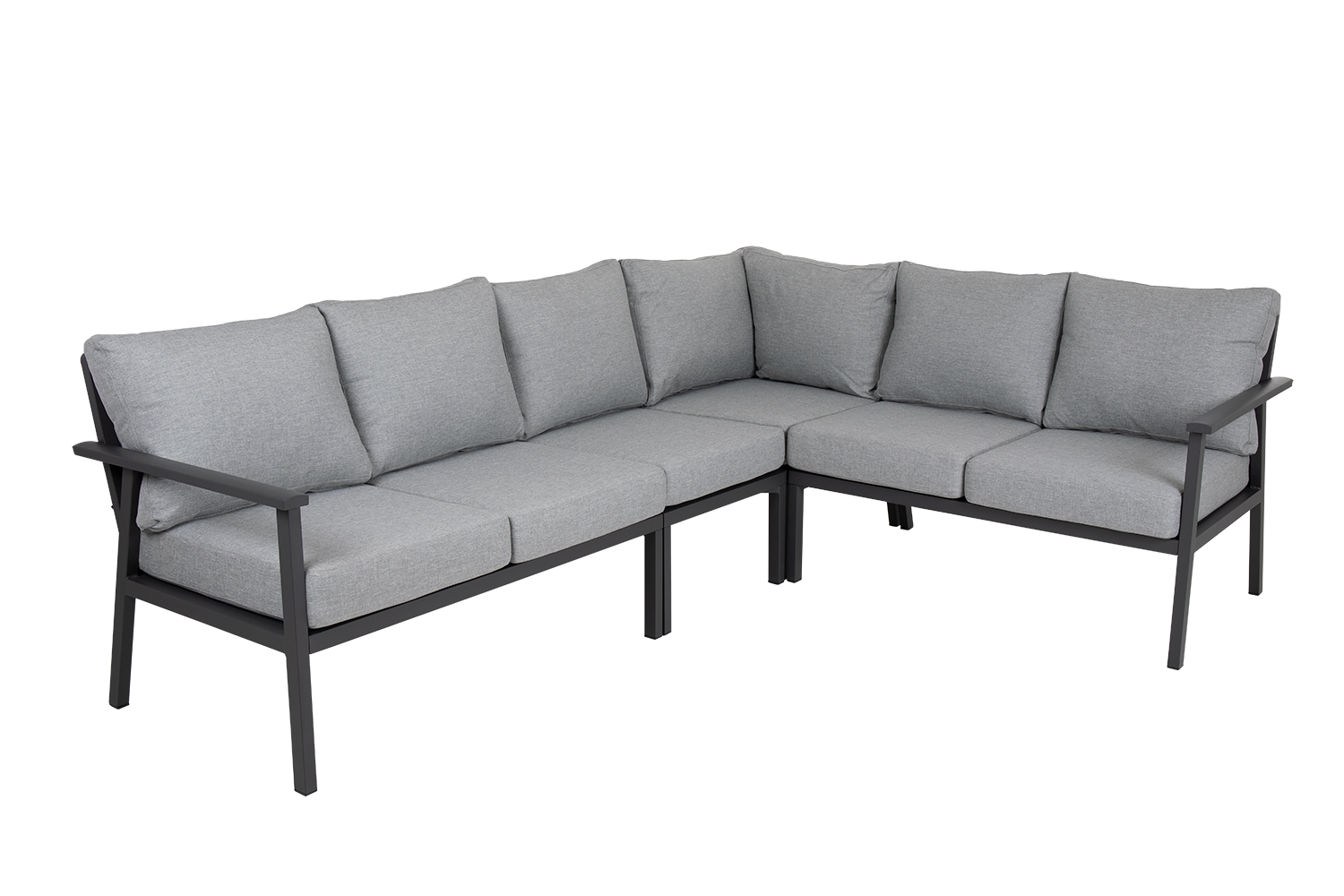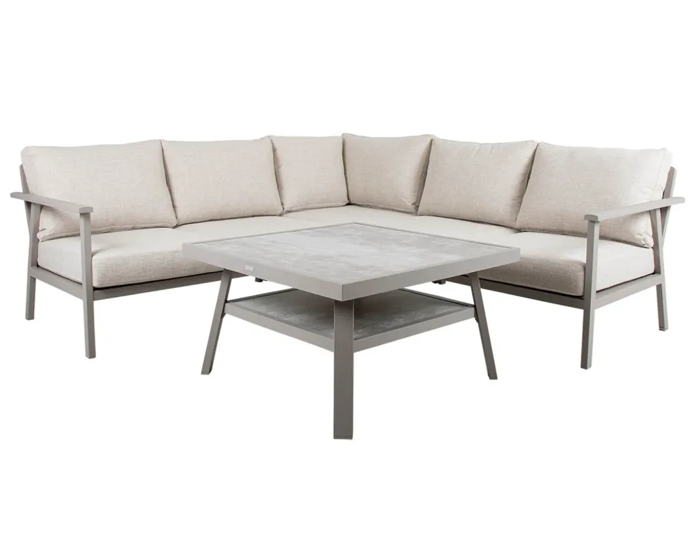 Rymlig och bekväm hörnsoffa i aluminium med extra sitthöjd för både avkoppling och middagar. Stilren design med vattentåliga dynor i olefintyg för maximal hållbarhet.