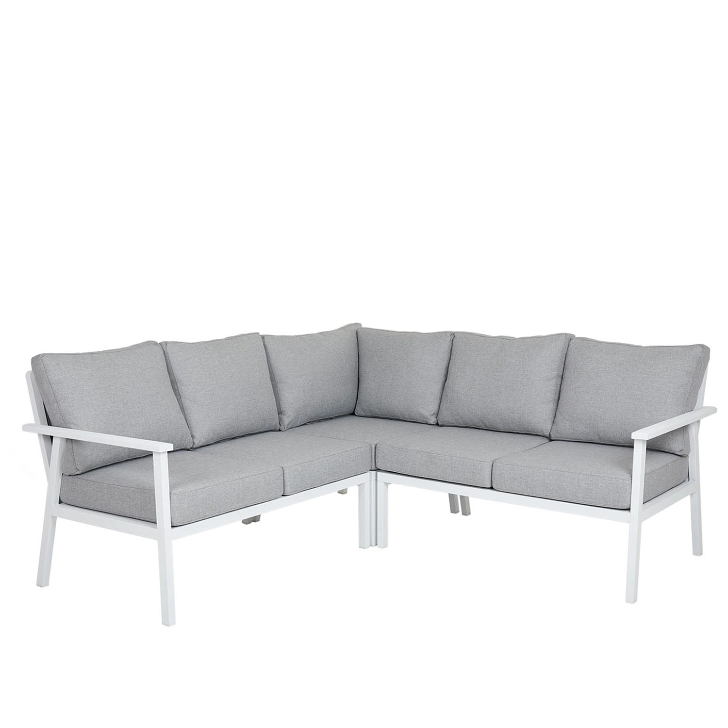 Rymlig och bekväm hörnsoffa i aluminium med extra sitthöjd för både avkoppling och middagar. Stilren design med vattentåliga dynor i olefintyg för maximal hållbarhet.