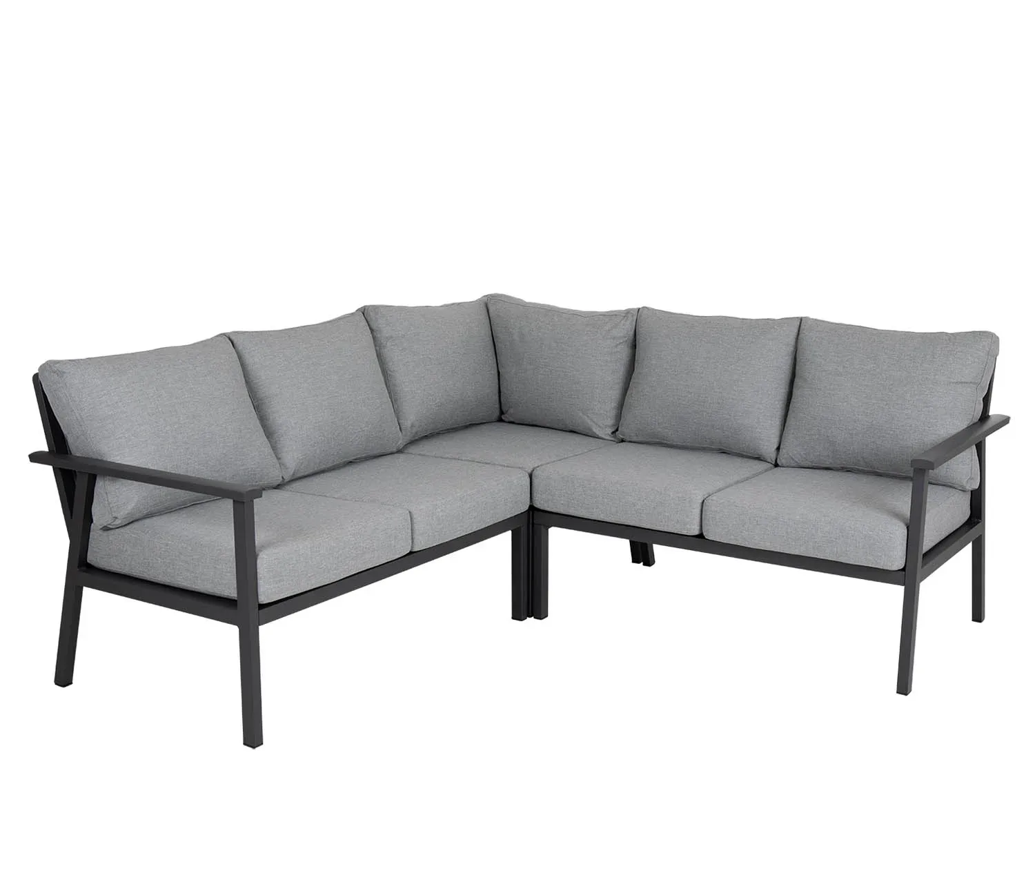 Rymlig och bekväm hörnsoffa i aluminium med extra sitthöjd för både avkoppling och middagar. Stilren design med vattentåliga dynor i olefintyg för maximal hållbarhet.