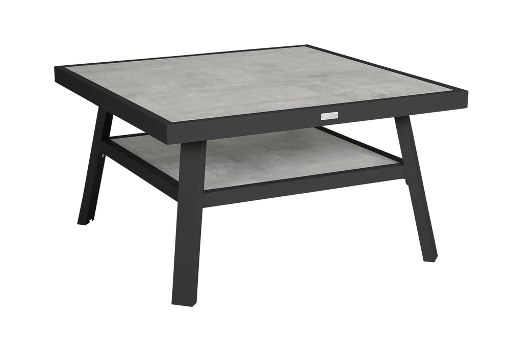 Hög hörnsoffa i aluminium med vattentåliga dynor, utemöbler.