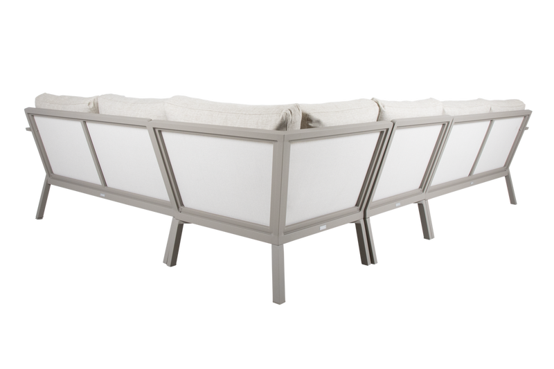 Hög hörnsoffa i aluminium med vattentåliga dynor, utemöbler.