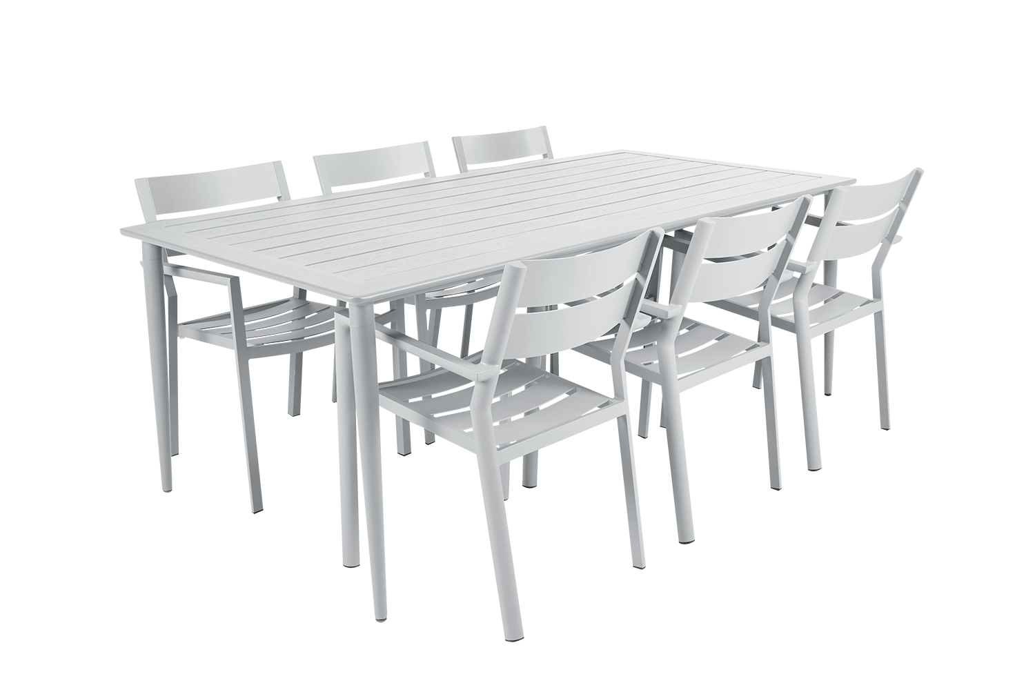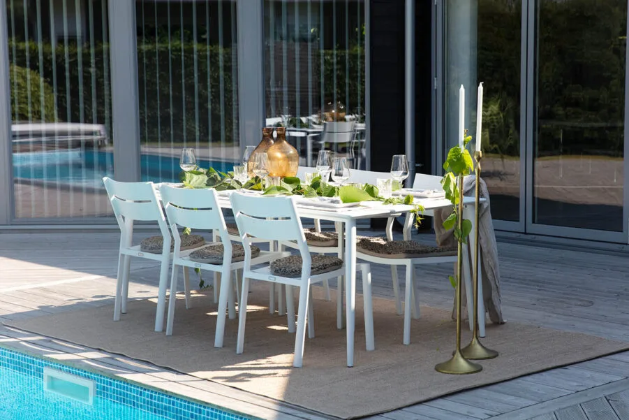 Brafab Nimes och Delia matgrupp i vit är den ultimata lösningen för dig som vill skapa en inbjudande och stilfull oas på din uteplats eller i din trädgård. Genom att kombinera det innovativa Nimes-bordet med de formsäkra Delia-karmstolarna får du en matgrupp som förenar modern skandinavisk design med exceptionell funktionalitet. Detta set är den perfekta lösningen för att maximera din utomhusmiljö utan att kompromissa med varken stil eller kvalitet, och erbjuder en harmonisk samlingspunkt för sommarens alla måltider under bar himmel.