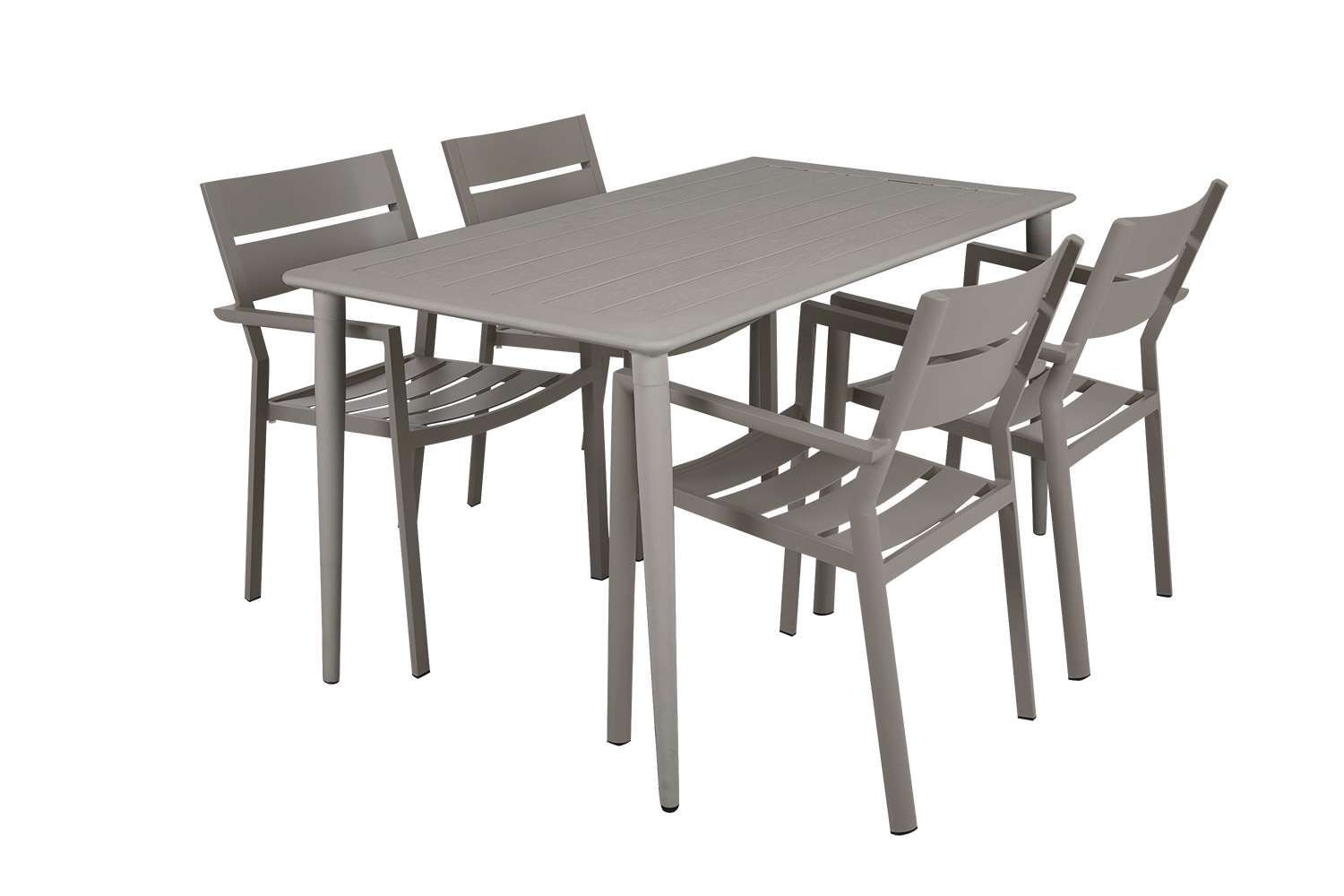 Funktionen i denna matgrupp är noggrant genomtänkt för att erbjuda högsta möjliga bekvämlighet. Delia-karmstolarna är designade med fokus på ergonomi, där de kurvade formerna maximerar sittkomforten och ger ett naturligt stöd. Bordets generösa mått på 140×78 cm ger gott om plats för fyra personer, och den ljuddämpande bordsskivan bidrar till en lugnare atmosfär vid måltiderna. Hela gruppen är underhållsfri och kan stå ute under hela sommarsäsongen, vilket gör den till ett praktiskt val för ett bekymmersfritt uteliv. Stolarna är dessutom stapelbara, vilket underlättar förvaring när de inte används.