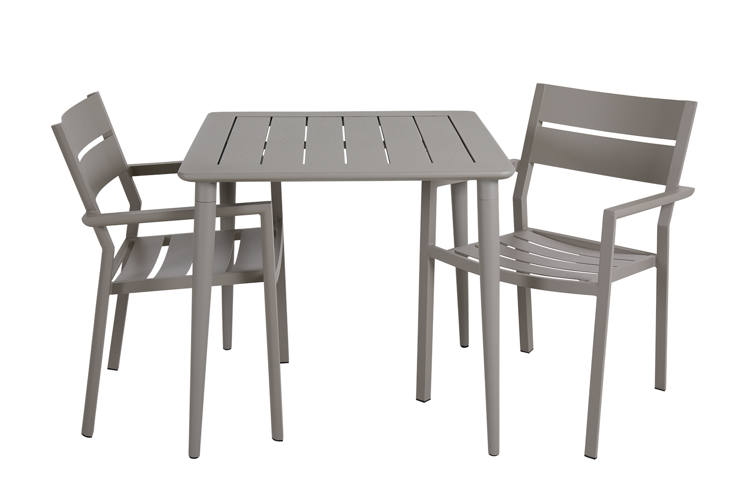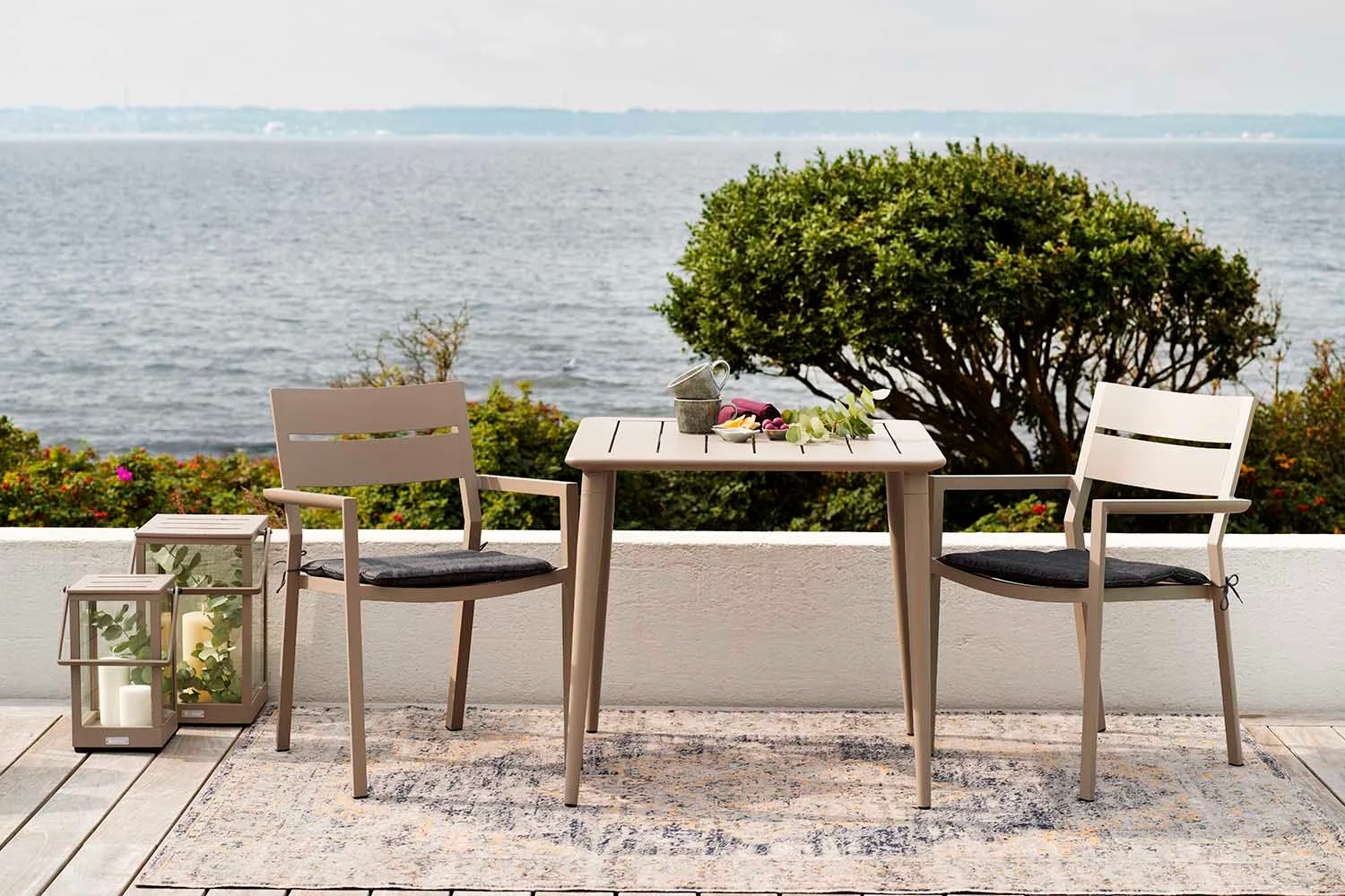 Funktionen i detta caféset är noggrant genomtänkt för att erbjuda högsta möjliga bekvämlighet på begränsade ytor. Delia-karmstolarna är designade med fokus på ergonomi, där de kurvade formerna maximerar sittkomforten och ger ett naturligt stöd. Bordets kompakta mått på 78×78 cm gör det idealiskt för mindre ytor, och den ljuddämpande bordsskivan bidrar till en lugnare atmosfär vid måltiderna. Hela gruppen är underhållsfri och kan stå ute under hela sommarsäsongen, vilket gör den till ett praktiskt val för ett bekymmersfritt uteliv. Stolarna är dessutom stapelbara, vilket underlättar förvaring när de inte används.