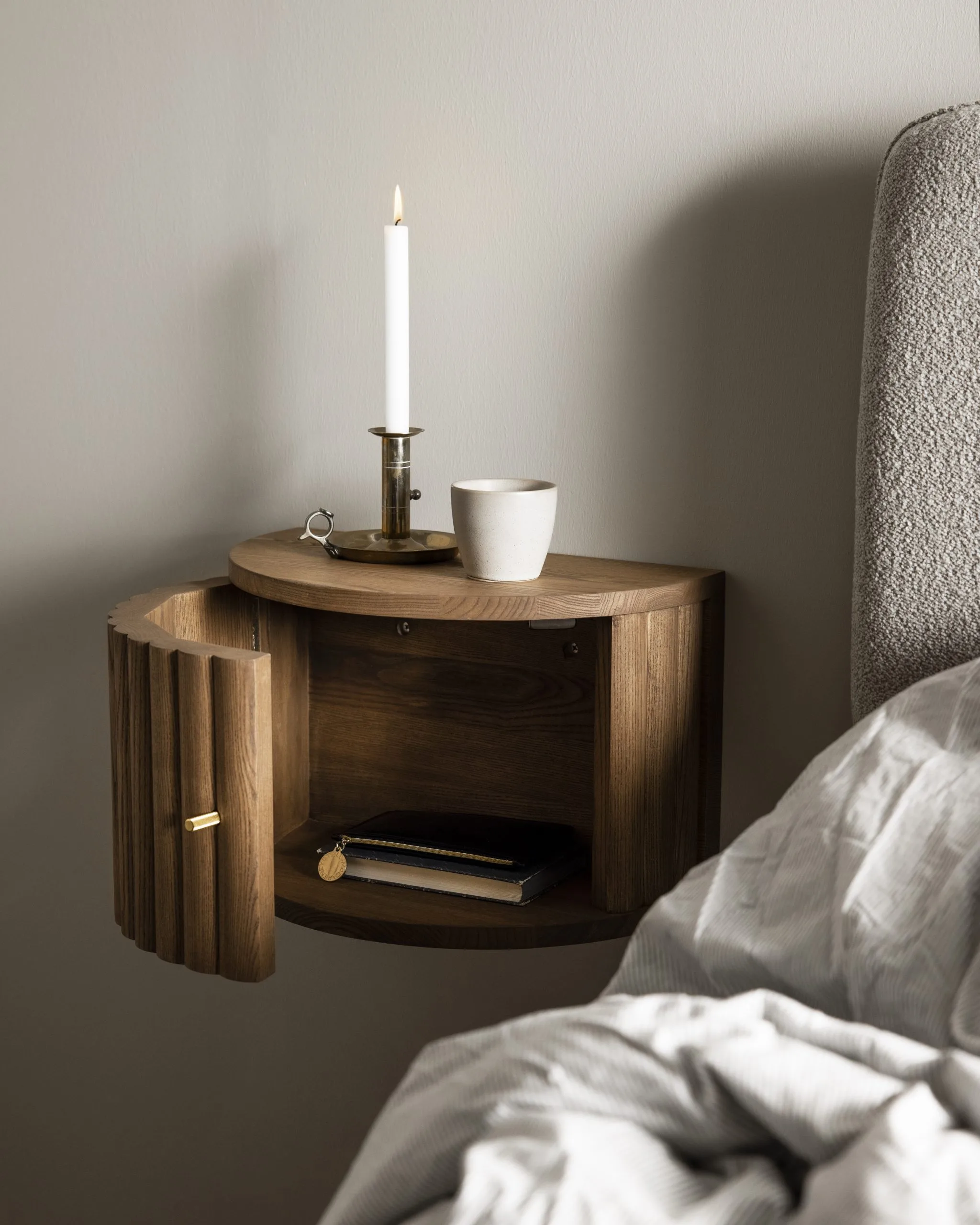 Sängbordet Velvet är designat av Cecilie Kamp, för Kristensen & Kristensen. Sängbordet har en elegant design, med retrolook, som sätter en lyxig prägel på sovrummet. Sängbordet hänger på väggen, vilket gör att du kan anpassa det efter höjden av sängen. Du kan välja sängbordet i ask eller ek, i flera behandlingar.